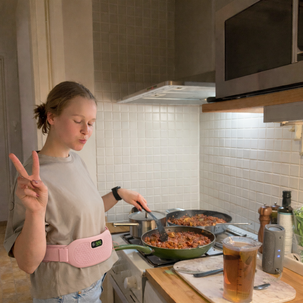 Je cuisine avec sans problème. Les mains libres et la chaleur ciblée me permettent de préparer le dîner sans inconfort menstruel.